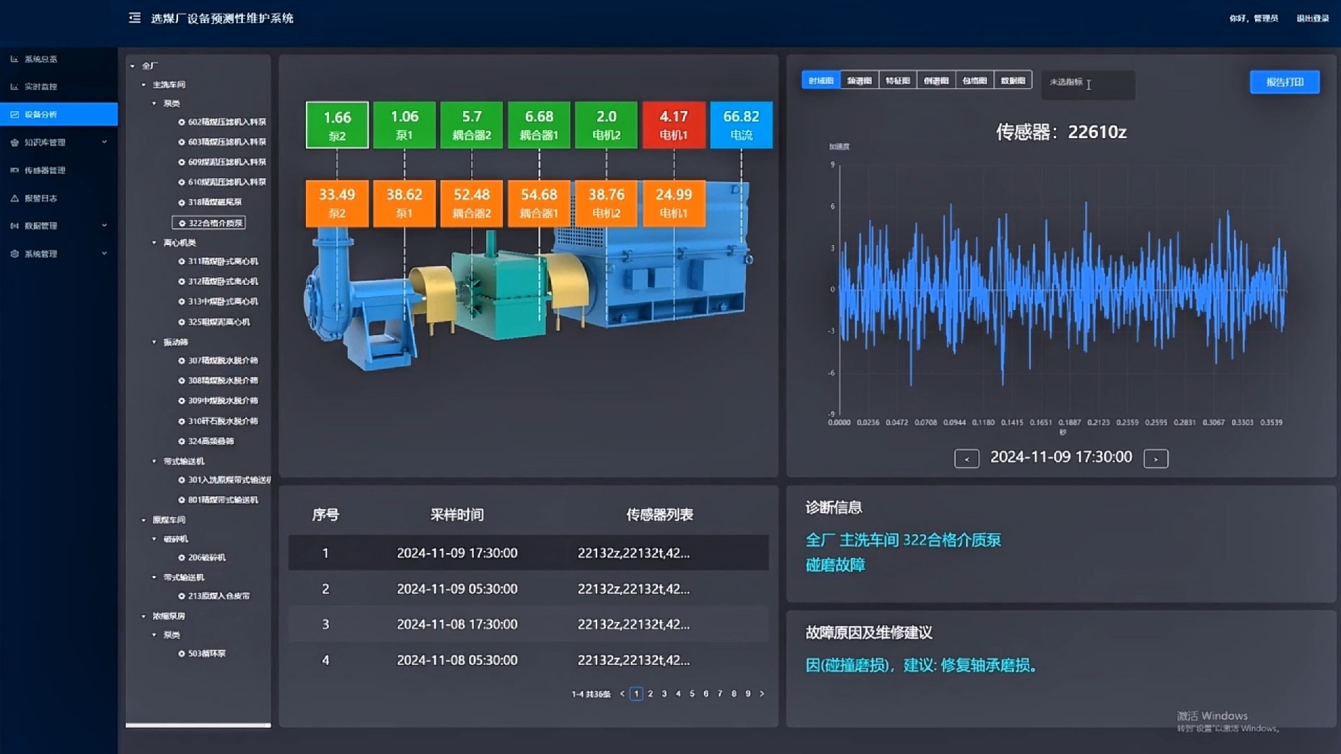 產(chǎn)品簡(jiǎn)介:選煤廠設(shè)備預(yù)測(cè)性維護(hù)系統(tǒng)實(shí)時(shí)采集選煤廠生產(chǎn)設(shè)備的多維數(shù)據(jù)(溫振數(shù)據(jù)、電氣數(shù)據(jù)、設(shè)備實(shí)時(shí)數(shù)據(jù)、設(shè)備管理數(shù)據(jù)、音視頻數(shù)據(jù)),利用先進(jìn)數(shù)字信號(hào)處理算法、人工智能算法、專(zhuān)家知識(shí)庫(kù)等方法對(duì)設(shè)備進(jìn)行實(shí)時(shí)監(jiān)測(cè)、故障分析和故障溯源。在設(shè)備出現(xiàn)異常時(shí),能夠分析出異常原因,給出合理維修建議,生成維修報(bào)告并白動(dòng)推送給檢修人員,指導(dǎo)檢修人員進(jìn)行設(shè)備維護(hù),實(shí)現(xiàn)流程化閉環(huán)管理。選煤廠設(shè)備預(yù)測(cè)性維護(hù)系統(tǒng)可早期發(fā)現(xiàn)設(shè)備異常,實(shí)現(xiàn)由“事后維修”向“預(yù)知檢修”的轉(zhuǎn)變,從而實(shí)現(xiàn)設(shè)備維護(hù)安全損失最小、總維護(hù)成本最低、總維修時(shí)間最少。