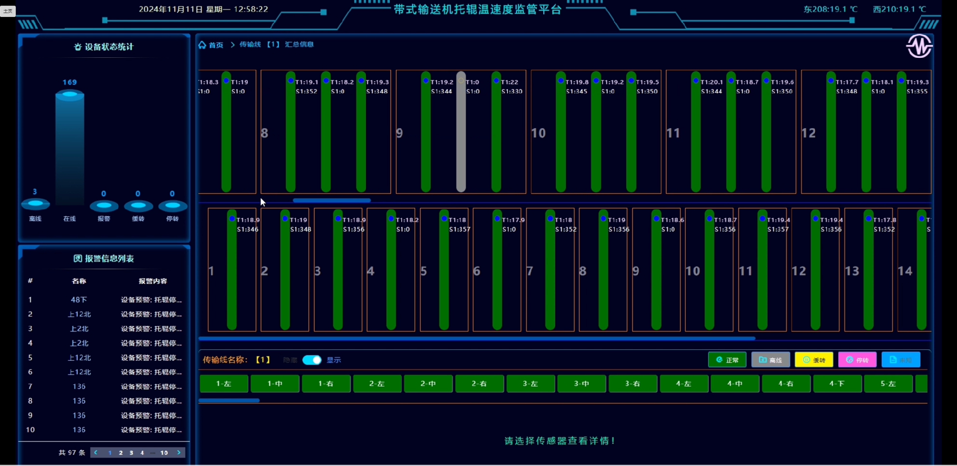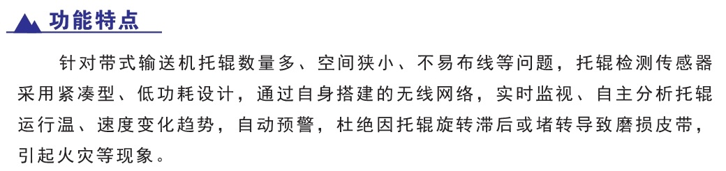 托輥是帶式輸送機中數量最多的組成部件,在運行過程中,由于托輥停轉與皮帶發(fā)生摩擦引起發(fā)熱,最終引發(fā)火災的事故層出不窮。無線組網的托輥溫速度檢測裝置可在線監(jiān)測托輥的轉速、軸溫變化趨勢,及時反映當前托輥的運行狀態(tài),代替人工巡檢,為帶式輸送機的穩(wěn)定運行保駕護航。